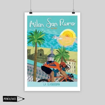 Milan-San Remo cycling artwork print, a celebration of the longest one day race in cycling. A must have for cyclists and cycling enthusiasts and also makes a wonderful gift.