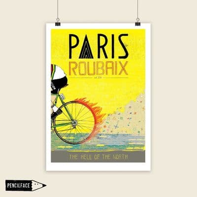 Paris - Roubaix cycling artwork print, a celebration of the famous 'monument' cycle race which take place in northern France every year. A must have for cyclists and cycling enthusiasts and also makes a wonderful gift.