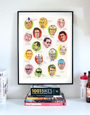 Pro's and Con's cycling artwork print, a celebration of famous cyclists and their nicknames throughout history from Coppi to Pantani. A must have for cyclists and cycling enthusiasts and also makes a wonderful gift.