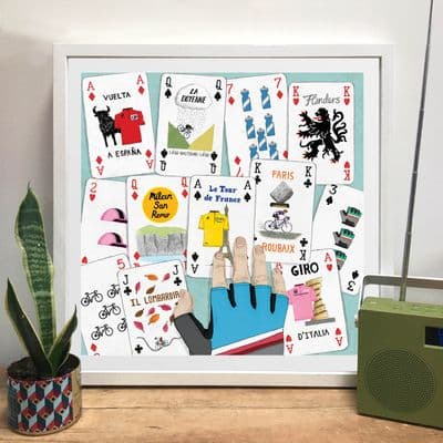 Shuffling the Pack cycling artwork print, originally an editorial commission for Cyclist magazine. A must have for cyclists and cycling enthusiasts and also makes a wonderful gift.